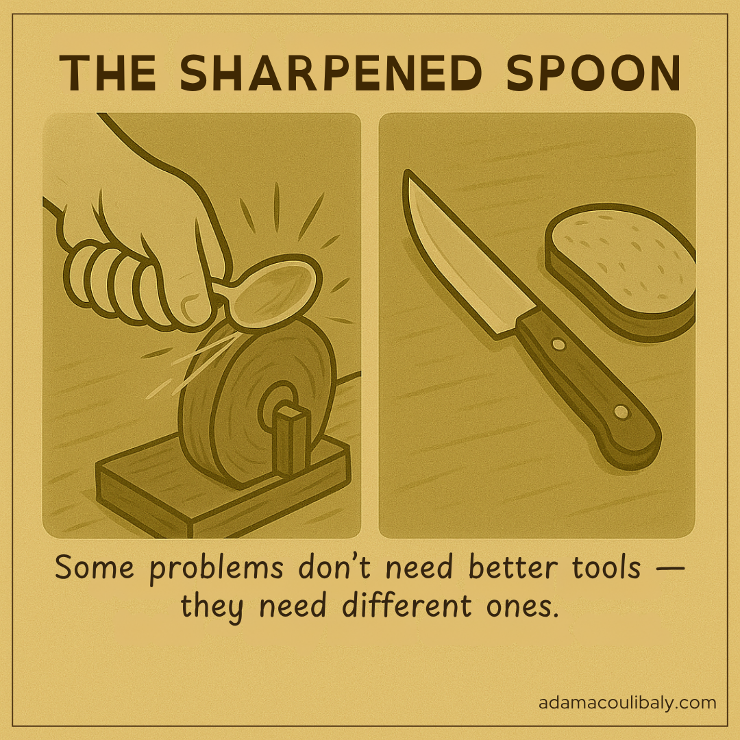 On nous a appris à essayer plus fort, à affûter nos outils et à croire que toute amélioration mène à une solution. Mais que se passe-t-il si l’outil n’est pas adapté ? Cette métaphore remet en question l’idée que le raffinement conduit toujours à la résolution. Une cuillère, aussi tranchante soit-elle, ne se transformera jamais en couteau.
